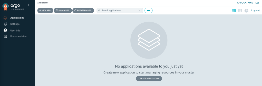 Make sure you are able to use the new password and login to argocd UI http://localhost:8080 using Username: admin. On successful login you will see something as below –