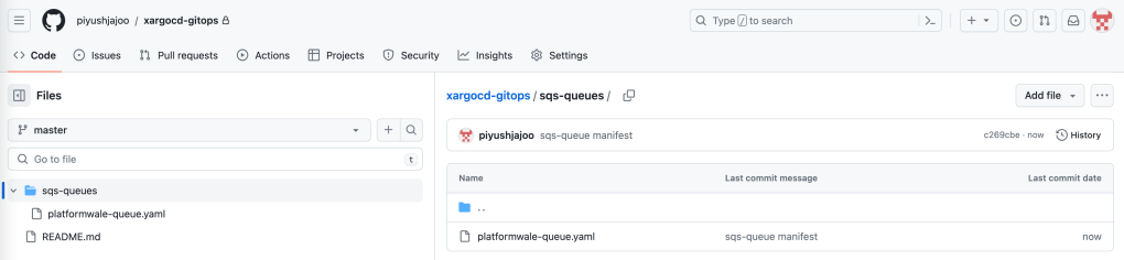 Create a commit with following YAML manifest in sqs-queues directory in the github repository you created earlier, this is the directory you had configured earlier with ArgoCD. In this scenario we are creating a new resource via GitOps.