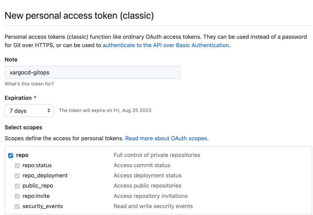 Create Personal access tokens (classic) with repo scope as below and click on Generate Token button, make a note of the token, we will need this while configuring ArgoCD to watch our private git repo –
