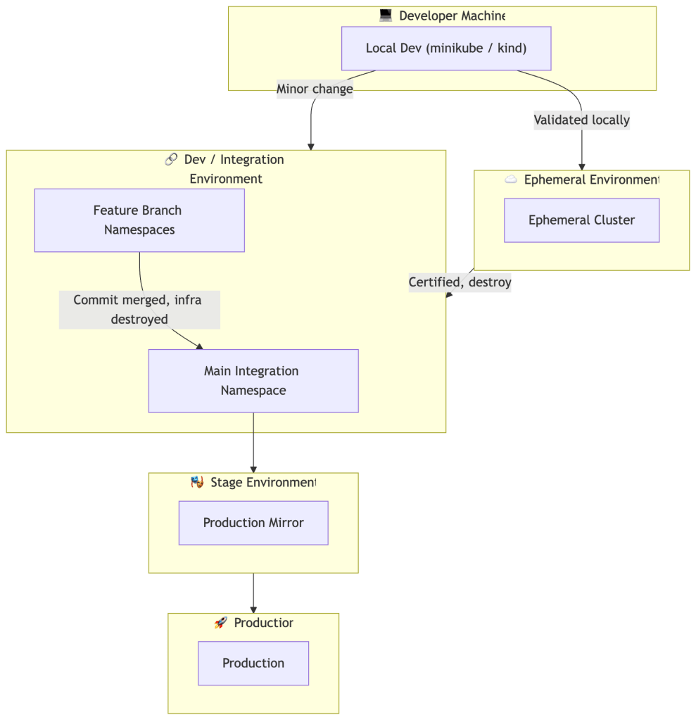 Namespace-based ephemeral is appropriate for most feature integration scenarios: stateless services, minor API changes, new endpoints. Cluster-based ephemeral is required when changes involve CRD modifications, service mesh upgrades, network policy changes, or control plane component experiments. Applying a CRD change in a namespace-based ephemeral environment will affect every other tenant in the shared cluster — that’s a cluster-scoped operation.