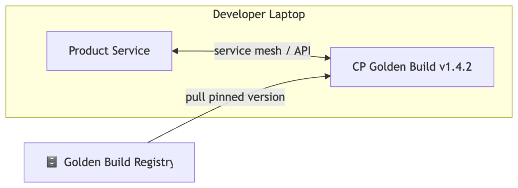 The key discipline here: the control plane golden build is not “whatever I last pulled” — it’s a versioned artifact. This prevents the silent version drift that causes “works on my machine” bugs before the code even reaches dev.
