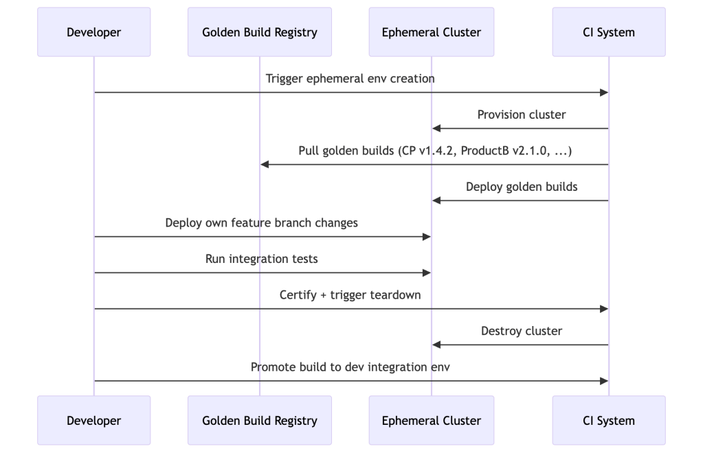 | Ephemeral | Validate breaking/cross-team changes | Breaking change or CRD modification detected | Integration tests pass; cert issued; destroy |