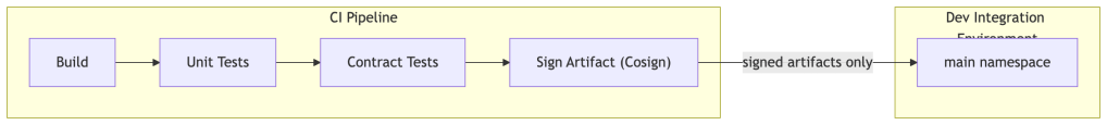 - Dev as shared scratch pad. The moment someone manually deploys an unsigned build to dev, the integration baseline is contaminated. Enforce signing at the GitOps controller layer, not on trust.