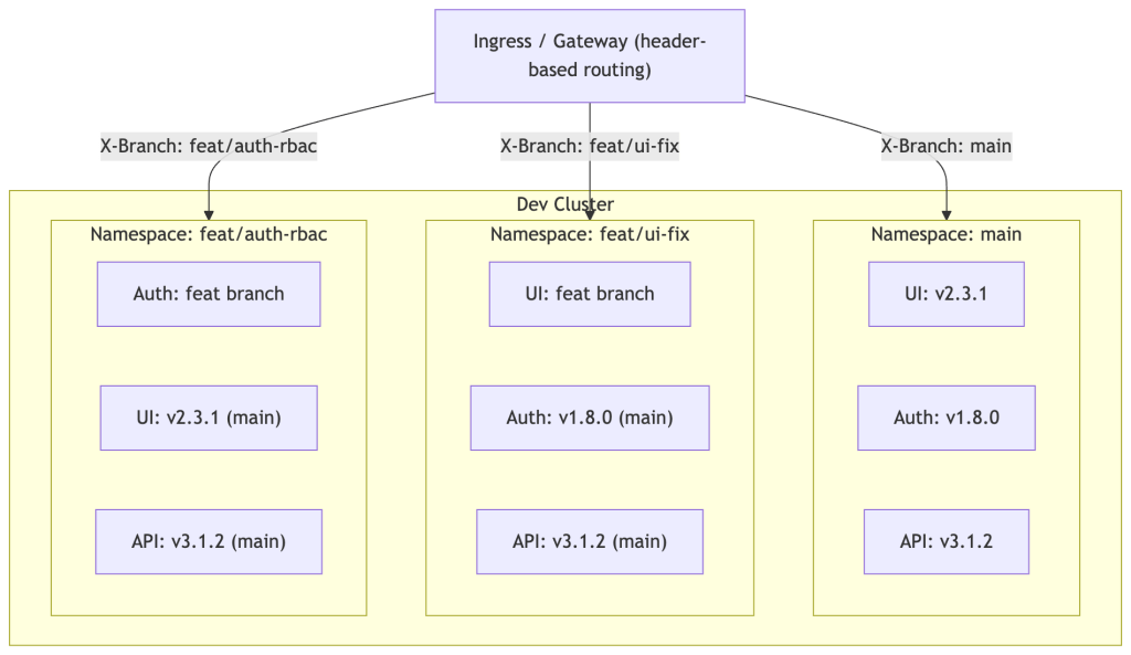 3. Service discovery across namespaces. When a feature-branch UI calls Auth, should it call the feature-branch Auth (if one exists) or fall back to main? This fallback routing logic needs to be explicitly defined — naive approaches cause subtle cross-namespace contamination that is extremely hard to debug.