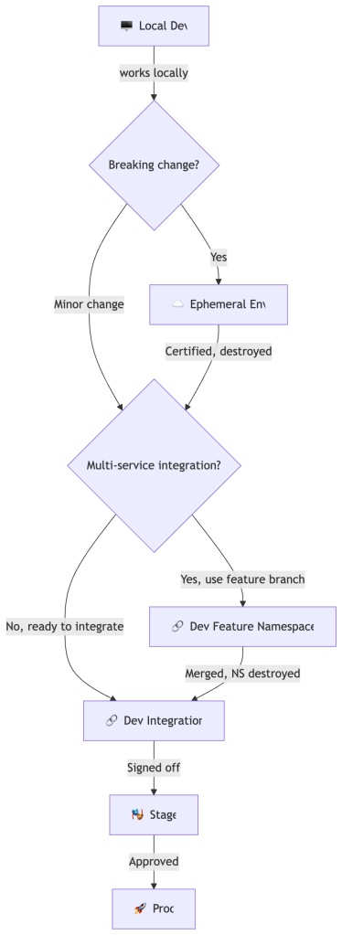 This is the most operationally nuanced piece. For minor, non-breaking changes, developers need a way to test integration without either (a) polluting the main dev namespace or (b) the overhead of a full ephemeral cluster.