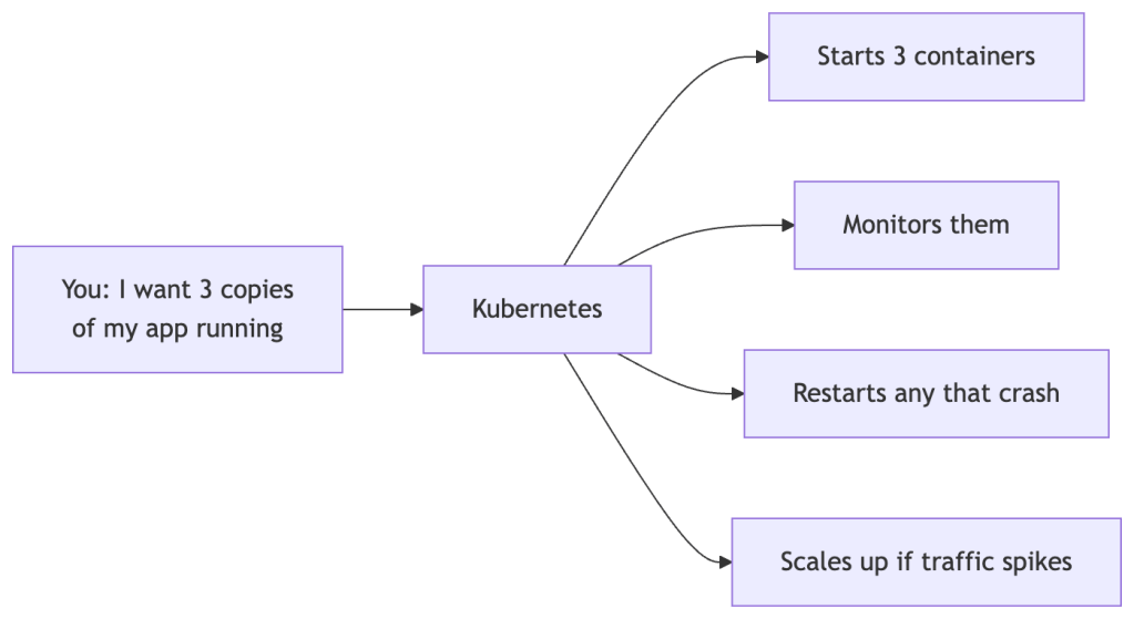 In plain English: Kubernetes is the conductor of an orchestra of containers. You declare what you want running, and it figures out how to make it happen and continuously keeps it that way.