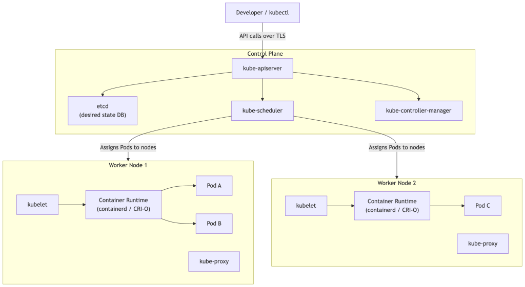 The front door to Kubernetes. Every command you run (via kubectl or any tool) goes through the API server over TLS. It validates requests, enforces authentication and authorization, and persists state to etcd.