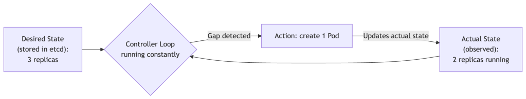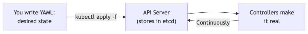This is the most important idea in the whole series. In Kubernetes, you don’t issue commands like “start this container now.” Instead, you describe what you want to exist, and Kubernetes continuously works to make reality match that description.