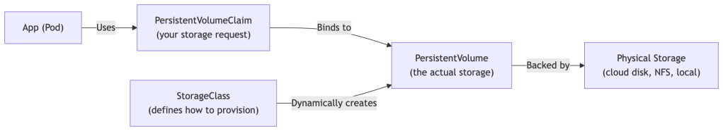 Containers are stateless by default โ their filesystem disappears when they stop. Volumes attach storage to Pods. PersistentVolumes (PV) are cluster-level storage resources that outlive individual Pods.