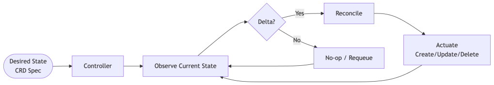 Controllers are implemented on top of event streams (watch events from the Kubernetes API), but their reconciliation logic is level-based, not edge-triggered. The trigger is event-driven; the behavior is not. Rather than reacting once to a specific event, the controller always asks “is the world in the state I want?” and drives toward that state regardless of how many events fired. This distinction matters enormously for resilience: if you miss an event, the next reconciliation catches it anyway. Contrast this with a purely edge-triggered system where a missed event means a missed action — permanently.