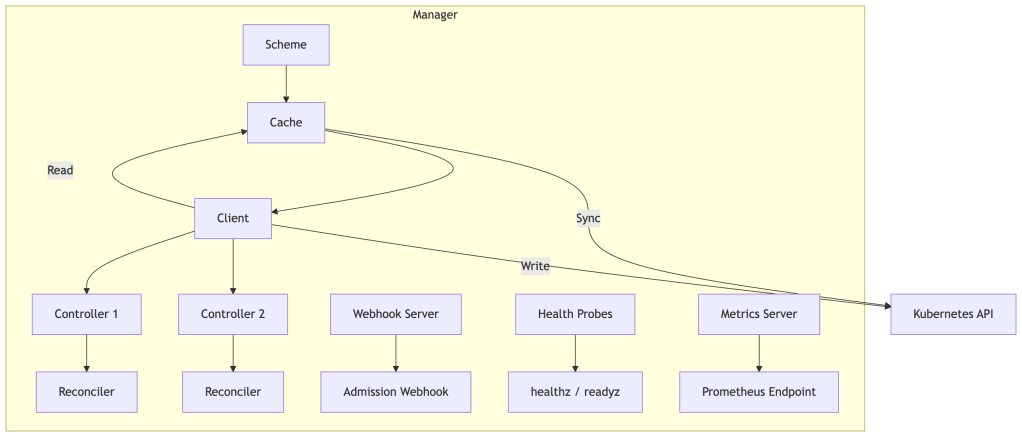 The controller-runtime library (used by both Kubebuilder and Operator SDK) provides the scaffolding that most operators are built on. Let’s dissect what it gives you.