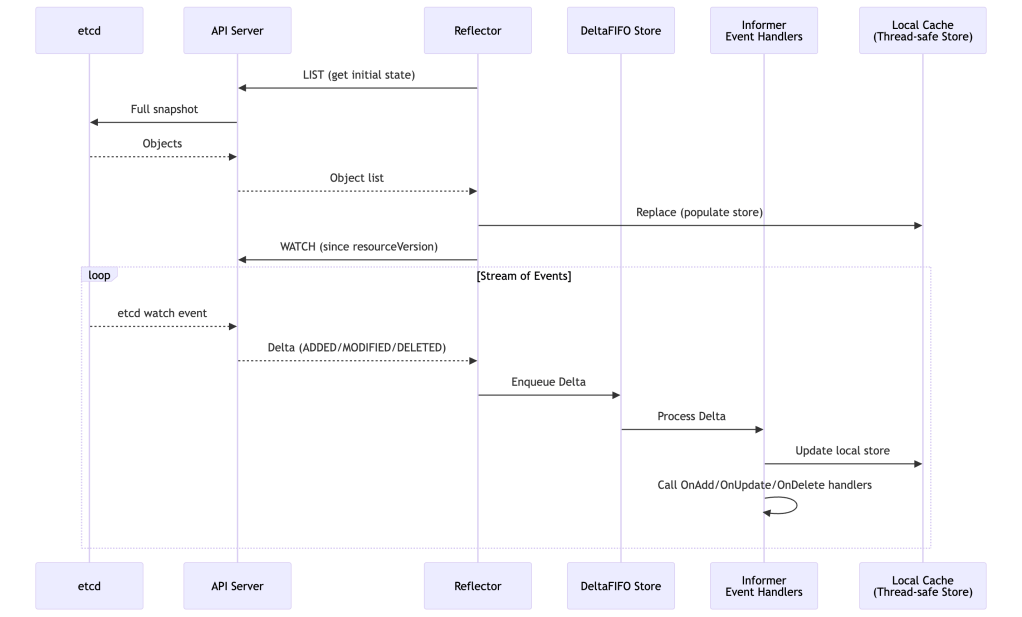 The Reflector does the heavy lifting: it first performs a List to establish the initial state, then starts a long-lived Watch. If the watch connection drops (network blip, API server restart), the reflector automatically reconnects and re-lists if necessary.