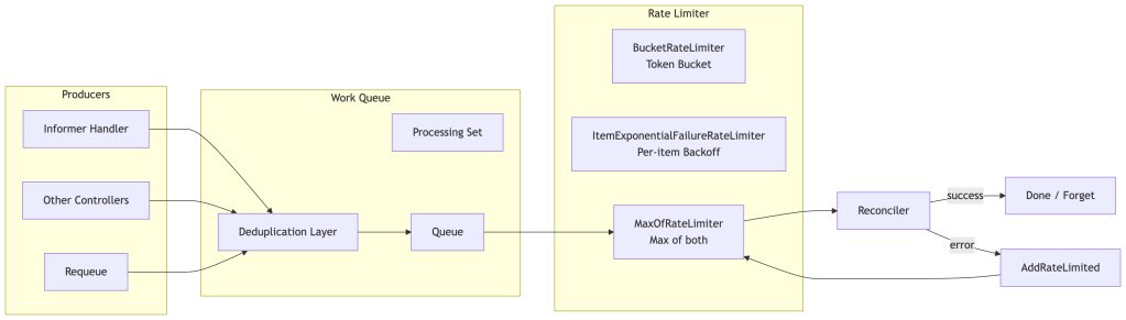 The default controller-runtime rate limiter combines per-item exponential backoff (base ~5ms, max ~1000s) with a global token bucket (~10 QPS, burst ~100). These defaults can vary across controller-runtime versions and are not guaranteed API contracts — always verify against your version’s source. In high-scale environments, you’ll almost certainly want to tune them.