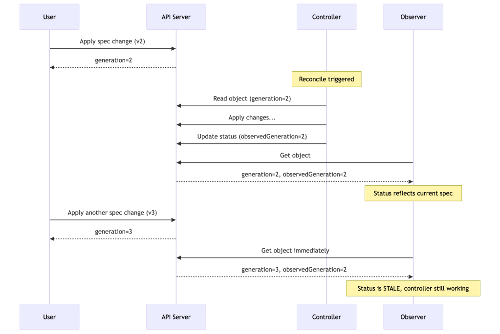 Without observedGeneration, a status.phase: Running is ambiguous — it could mean “running the spec you just applied 30 seconds ago” or “running an old spec that’s three versions behind.” With it, observers have a precise, reliable signal.