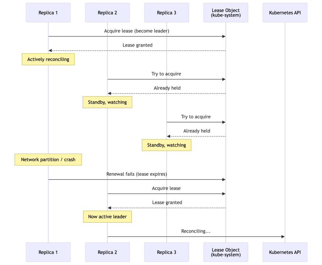 Important nuance: Leader election reduces the likelihood of concurrent reconciliations, but it does not eliminate it entirely. During the lease expiry window, a brief overlap is possible where both the old and new leader are active. Controllers must still be written to tolerate conflicts and retries. Never assume strict single-threaded execution at the cluster level — your reconciler must be safe to run concurrently.