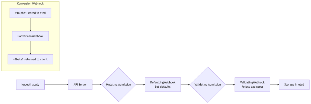 Defaulting Webhooks (MutatingAdmissionWebhook) run before storage and let you inject default field values. This is essential for forward compatibility — when you add a new required field to v2 of your CRD, a defaulting webhook can populate it for resources created without it.