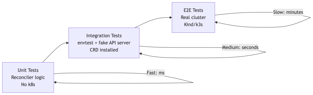 Use envtest (from controller-runtime) for integration tests. It spins up a real etcd and API server, installs your CRDs, and lets you test full reconciliation loops without a cluster. This is your most valuable testing layer.
