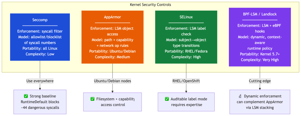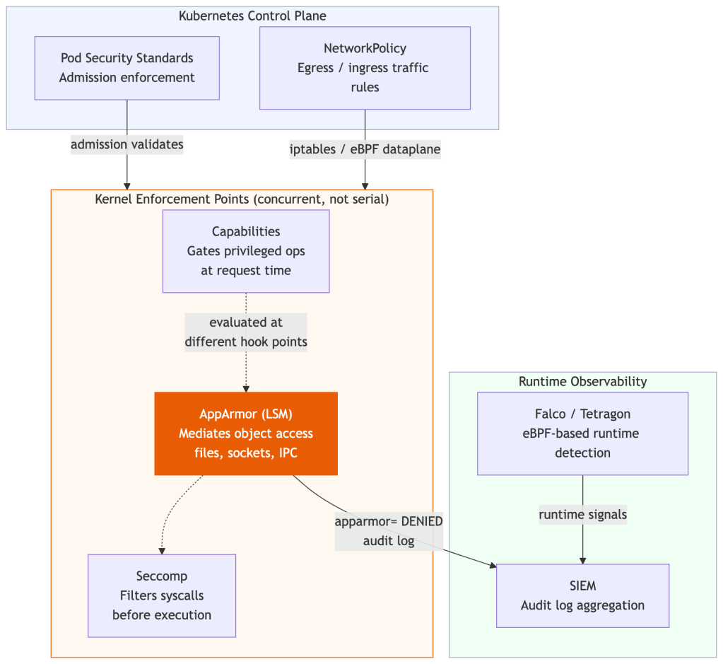 One framing worth keeping: Kubernetes doesn’t implement these controls — it orchestrates them. securityContext, appArmorProfile, and seccompProfile are instructions to the Linux kernel. The real enforcement always happens below the Kubernetes abstraction layer, in the kernel’s syscall path. Understanding that boundary is what prevents “we have AppArmor configured” from being confused with “we have AppArmor enforcing what we think it is.”