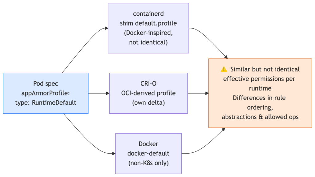 RuntimeDefault is not a single profile. It’s an instruction to the container runtime to apply its own default profile — and that profile differs across runtimes.