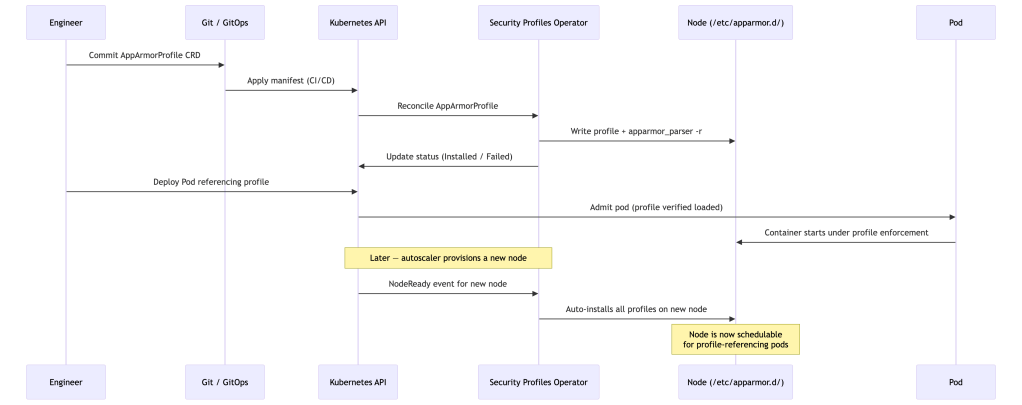The naive approach is a DaemonSet that writes profile files and runs apparmor_parser -r. This works until it doesn’t — profile updates require careful ordering, new nodes joining the cluster won’t have profiles until the DaemonSet pod schedules there, and you have no audit trail.