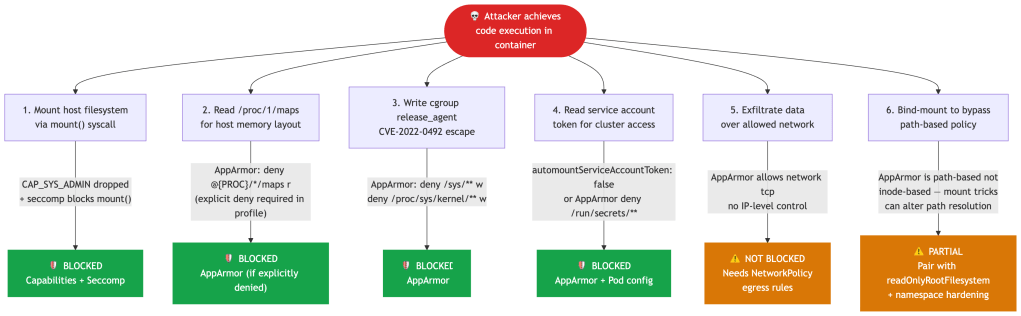 AppArmor has real blind spots: network exfiltration, in-memory attacks, kernel exploits, and path-based bypass via mount manipulation. Seccomp has its own: it cannot enforce path-level access control, cannot reason about what allowed syscalls operate on, and cannot make stateful policy decisions. These aren’t reasons to skip either control — they’re reasons to understand what you’re actually enforcing and pair both with NetworkPolicy and runtime detection.