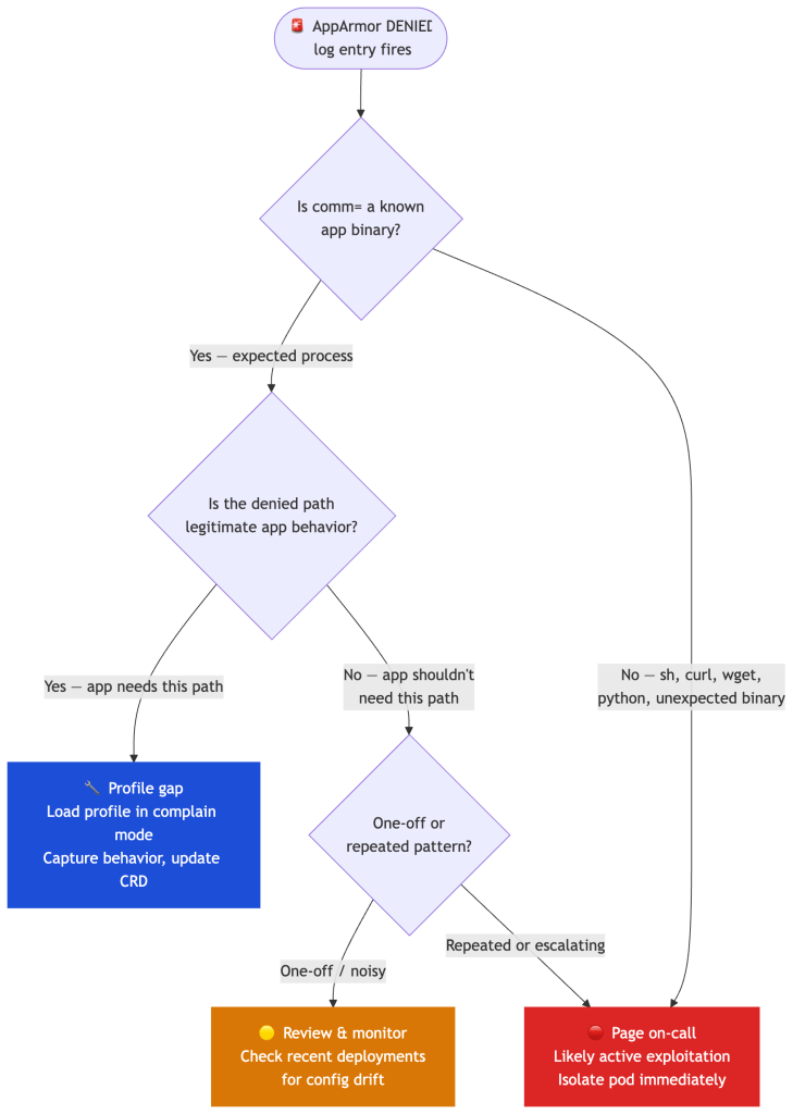 The operation, profile, name, and comm fields tell you exactly what was denied, by which profile, from which binary. When a denial fires, the triage path matters: