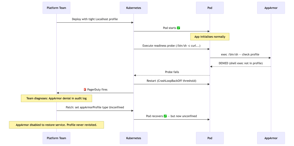The compounding failure: Under pressure at 2am, the team set type: Unconfined and moved on. That pod has been running without AppArmor enforcement for six months. Nobody notices because it’s not visible in normal kubectl output.