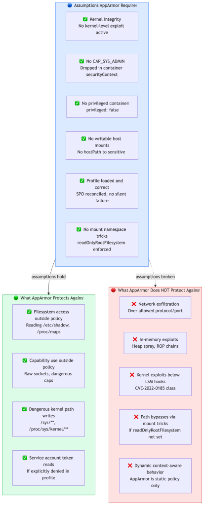 AppArmor is a meaningful control within a specific set of assumptions. Outside those assumptions, it provides weaker or no protection. Being explicit about this boundary is what separates operational security from security theater.