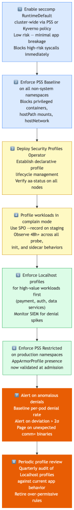 Step 1 before AppArmor: Seccomp RuntimeDefault is lower risk, higher portability, and easier to validate. Getting it in first means AppArmor is hardening a surface that’s already narrowed. Don’t try to do both simultaneously — sequence reduces blast radius.