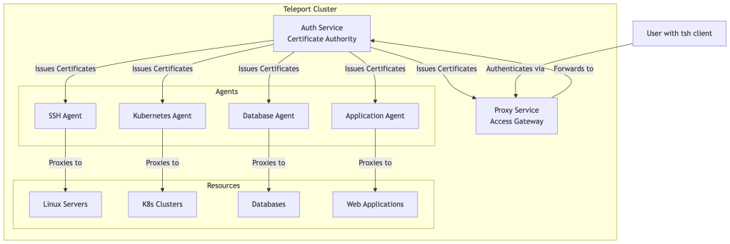 Teleport addresses these challenges through a certificate-based authentication model, unified access proxy, and comprehensive audit logging.