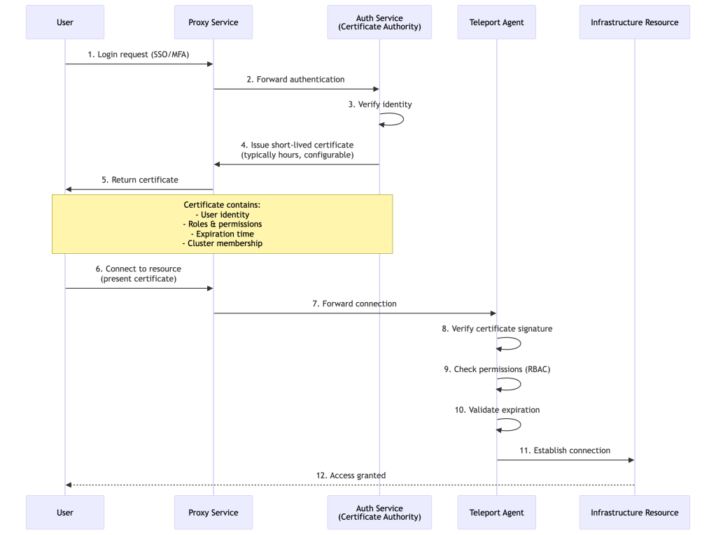 Teleport operates as a certificate authority (CA) that issues short-lived certificates to both users and infrastructure resources. This is fundamentally different from traditional password or SSH key-based authentication.