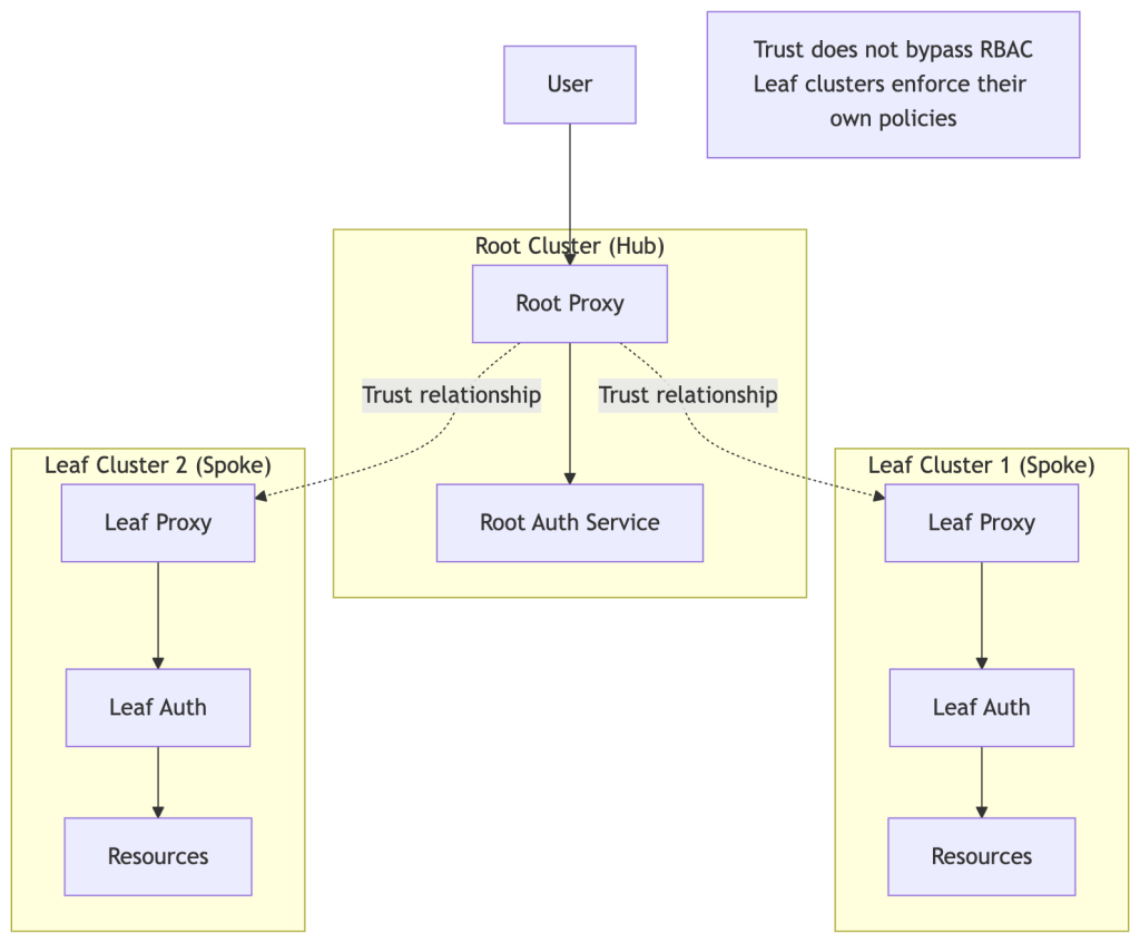 - Use a single cluster until you have a concrete reason not to. Trusted Clusters add operational overhead — don’t adopt them for organizational tidiness alone.